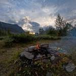 Packrafty nafukujeme přímo v bazénku pod peřejí a trojkovými úseky uháníme dál k pětkové perličce Unna Kartje, kterou po důkladné prohlídce trochu ošulíme linií podél levého břehu. Pod ní řeka na zbytek dne výrazně zpomalí, až se okolo čtvrté už nechce pádlovat dál. Omylem totiž nacházíme parádní místo na stany na kamenité vyvýšenině nad řekou. Kromě nádherného výhledu je tu i ohniště s roštem na ryby a z tišiny nad peřejkou nakonec vytáhneme sivena a štiku. Rozdělat oheň v mrholení se setměním sice zabere dost času, ale stojí za to. Ryby chutnají jako… čerstvé ryby. Co víc si přát.