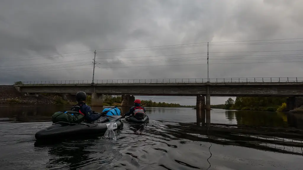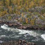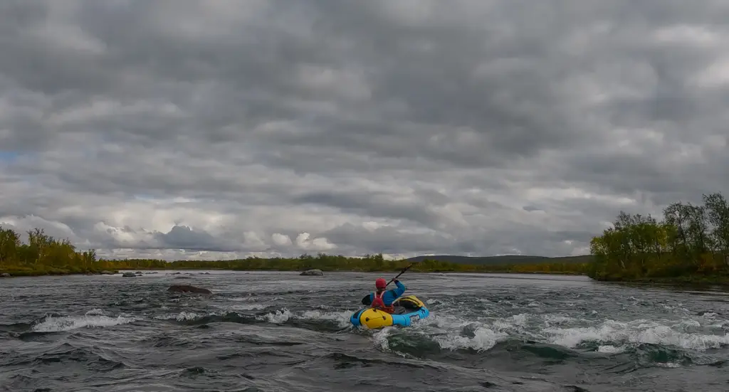 Do cíle našeho putování zbývá nějakých 45 km, a protože času máme nadbytek, ještě více zpomalíme a užíváme si zbytek řeky do syta. Ve spodním toku už není tak opuštěná, na břehu stojí sem tam chaty, za to je stejně krásná jako výše, a ještě o něco zábavnější. Vodopád ústí v dlouhou sekci krásných peřejnatých pětek, čtyřek a trojek, kterou se po bedlivém prohlížení každého úseku nakonec probíjíme po nějakých třech hodinách bez ztráty kytičky. Ostatně klasifikaci je tu nutné brát s rezervou. Vody je méně, než je obvyklé, a laponským zvykem bývávalo hodnotit peřeje pro plavbu na kánoi – pro packrafty je tak trochu přestřelená.