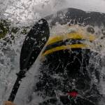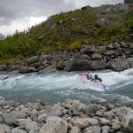 Ráno je poprvé šedivé a sem tam deštivé. Pod mostem u chaty nafukujeme znovu packrafty a s lehkou nervozitou vyrážíme. Dnes nás čeká peřejnatá část řeky s obtížností až do WW V. Na rozkoukání to pěkně houpe, řeka je úzká, sem tam padlý strom, který jde ovšem lehce objet. Scoutujeme první čtyřku s dvěma většími válci – projíždíme ji po jednom s případnou záchranou čekající s házečkou na břehu. Bez ztráty kytičky.