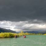 Garmin se neplete. Než stačíme ráno vyplout, oblaka se zdvihají a je tu další na Laponsko nepřirozeně teplý pozdně letní den. První kilometry na Kaitumälven jsou opět volejnatá Hančovina, sem tam s menším proudem, za to s nádhernými panoramaty hornatého Laponska všude kolem. Ze břehu na nás kouká los, sem tam se v břízách mihne sobí stádo. Řeka se čas od času rozteče malou peřejí, aby za ní opět utichla. Až po patnácti kilometrech putování se definitivně zužuje a na řadě je první parádní úsek Liettikkuikka značená jako WW IV. Jsou tu velké vlny, ale jinak nic, co by překáželo jejímu proplutí.